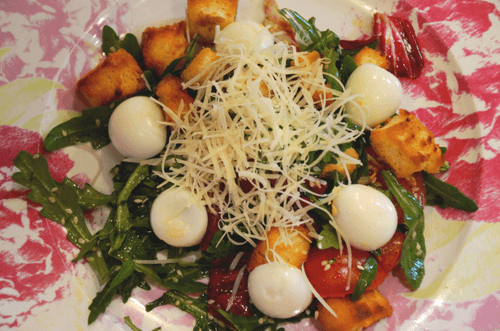 В чашу выкладываем рукколу, помидоры, сухарики, кунжут, заправляем и аккуратно перемешиваем
