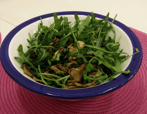 Смешайте в салатнике готовые грибы с рукколой и мелко нарезанным зелёным луком.