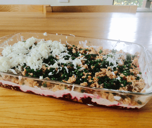 1 слой: отварить или запечь свеклу, натереть на терке, выложить в широкую невысокую форму.