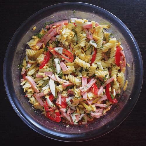 Итальянский салат с макаронами, ветчиной и солеными огурцами