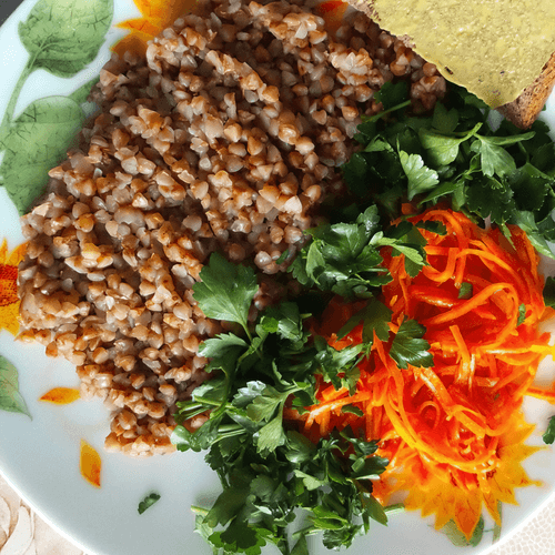 Лук удалить из сковороды при помощи специальной ложки с отверстиями (масло должно остаться в сковороде) и выбросить. Горячим маслом полить морковь с чесноком и специями и хорошо перемешать.