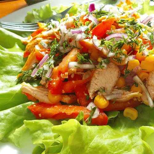 Легкий салат из овощей и куриной грудки с йогуртовой заправкой — это воплощение свежести и легкости, идеально подходящее для легкого ужина или обеда. Этот рецепт основан на европейских гастрономических традициях, где сочетаются простые и полезные ингредиенты. Нежная куриная грудка, обжаренная до золотистой корочки, прекрасно гармонирует с хрустящими листьями салата, сладостью кукурузы и пикантностью красного лука. Болгарский перец добавляет яркости и свежести, а натуральный йогурт смягчает вкусовые акценты, создавая легкую, но насыщенную заправку. Этот салат можно подавать как самостоятельное блюдо или как гарнир к основному блюду, а его польза для здоровья делает его отличным выбором для тех, кто следит за питанием. Простота приготовления и сбалансированный вкус делают его универсальным и любимым среди многих.