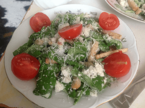 Готовое филе нарезать пластами и поджарить до золотистой корочки. Смешать филе, салатные листья, помидоры и чеснок. Заправить салат соусом «Цезарь» или простым майонезом.