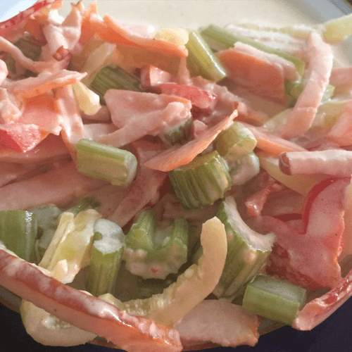Салат из сельдерея с грудкой индейки – это яркий представитель американской кухни, сочетающий свежесть овощей с нежностью жареного мяса. Сельдерей, известный своими освежающими нотками, гармонично переплетается с сочными кусочками индейки, пропитанными сливочным маслом. Желтый перец добавляет сладковатый оттенок, а пикантный соус на основе сметаны, майонеза и горчицы делает вкус насыщенным и многогранным. Этот салат идеально подходит как легкий ужин или питательный перекус. Благодаря сочетанию свежести и насыщенного вкуса, он прекрасно дополняет праздничный стол или радует гостей на семейных встречах. Простота приготовления делает его отличным выбором для тех, кто ценит баланс между здоровьем и гастрономическим удовольствием.