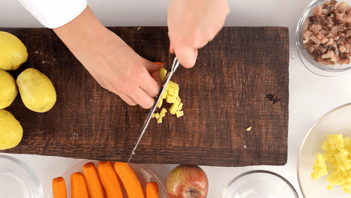 Полкило картошки и полкило моркови очистить и отварить в подсоленной воде до готовности, охладить и нарезать аккуратными мелкими кубиками.