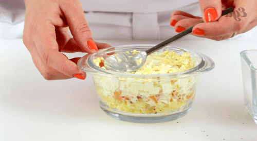 Все компоненты по отдельности перемешать с небольшим количеством майонеза, посолить, поперчить по вкусу.