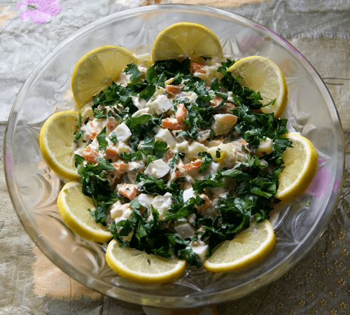 Петрушку мелко нарубить. Выложить в миску яйца, картофель и морковь, заправить соусом, посолить по вкусу, перемешать. При подаче посыпать зеленью и украсить ломтиками лимона.