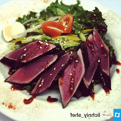 Смешать все продукты с соусом. Выложить на тарелку. Пожарить тунец, обваляв предварительно в молотом перце. Нарезать небольшими кусочками. Все украсить помидорами черри и перепелиным яйцом.