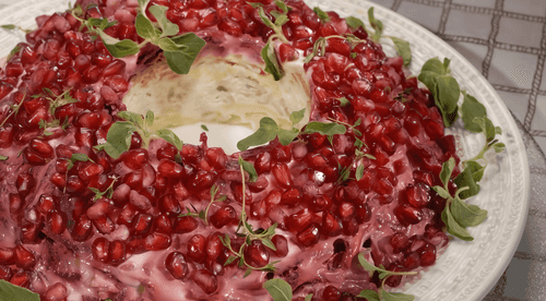 Салат «Гранатовый браслет» острый – это эффектное и пикантное блюдо, пришедшее из русской кухни. Его узнаваемая форма напоминает элегантный браслет, а яркие гранатовые зерна делают его визуально привлекательным. Этот салат сочетает нежное куриное филе, ароматные овощи и орехи, создавая насыщенный вкус с легкой сладостью свеклы и хрустящей текстурой. Острая нотка табаско придаёт пикантность и делает вкус более глубоким. Заправка из сметаны и чеснока объединяет все ингредиенты, создавая гармоничное блюдо, которое идеально подойдет для праздничного стола. Салат отличается насыщенным вкусом и интересным сочетанием ингредиентов, а гранатовые зерна добавляют приятную кислинку, делая его по-настоящему изысканным.