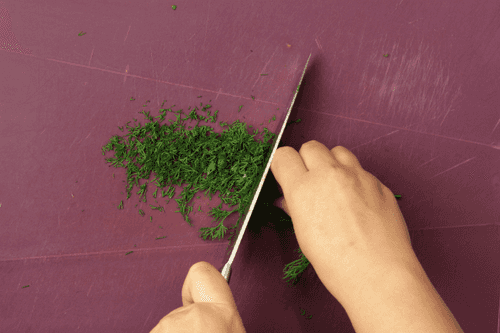 Зеленый лук нарезать соломкой. Веточку укропа отложить для украшения, остальной мелко нарезать.