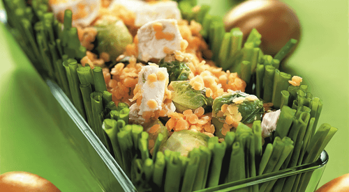 Теплый салат с чечевицей, брюссельской капустой и куриной грудкой