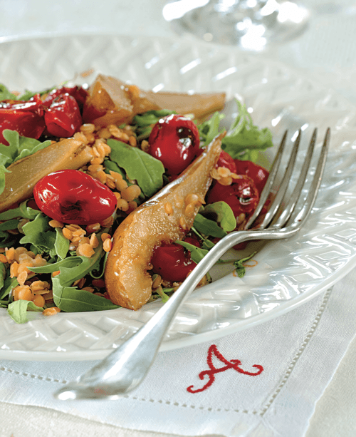 Теплый салат из чечевицы с грушей и печеными томатами