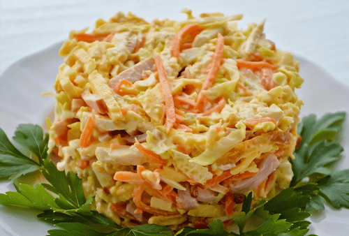 Салат с корейской морковью, ветчиной и омлетом