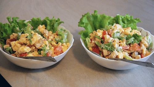 В ходе приготовления — омлет активно перемешиваем. Так как нам для нашего салата понадобятся воздушные кусочки получившегося омлета.