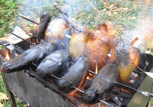 На открытом огне до корочки запекаем их. Если есть место, все одновременно, если нет, то баклажаны первыми. Когда кожица овощей слегка обуглится, снять шашлык с огня.