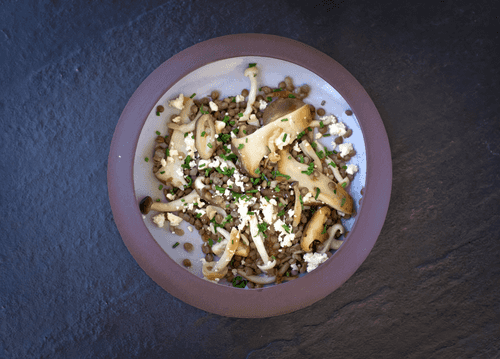 Теплый салат с грибами, чечевицей и сыром фета