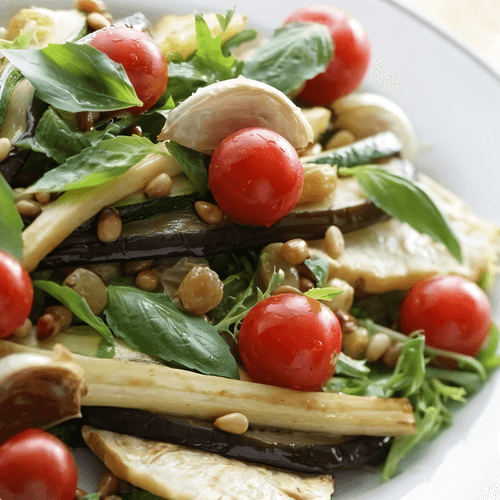 Теплый салат с запеченными овощами, зеленью и кедровыми орехами