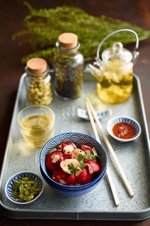 Китайский острый салат из редиса — это яркое и пикантное блюдо, которое отражает традиции восточной кухни. В его основе лежит хрустящий редис, пропитанный ароматами острого масла, приготовленного из хлопьев чили и кукурузного масла с добавлением имбиря. Этот процесс делает салат невероятно насыщенным и пряным. Комбинация соевого соуса, кунжутного масла и сахара придает блюду баланс между остротой, сладостью и глубокой умами. Салат идеален как закуска, пробуждающая аппетит, или дополнение к основным блюдам китайской кухни. Его можно подавать к жареному мясу, морепродуктам или рису, а также наслаждаться отдельно. Простота приготовления и гармония вкусов делают его прекрасным выбором для любителей острых и ароматных блюд.
