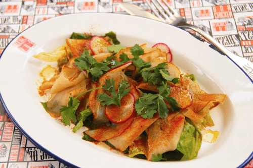 Готовое блюдо украсить редисом, нарезанным на тонкие слайсы, кинзой и копченой паприкой