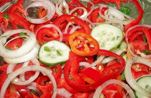 Овощи выложить в глубокую салатницу слоями, каждый слой слегка посолить и поперчить, сверху положить лук.