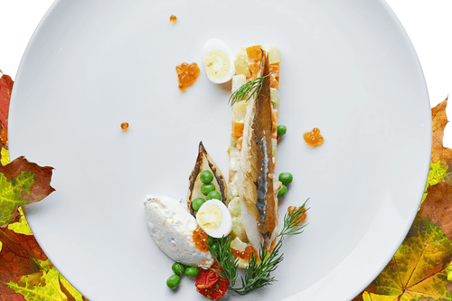 Салат со скумбрией и осенними овощами — это утонченное сочетание традиционных русских вкусов с современным кулинарным акцентом. Нежность копченой скумбрии гармонирует с теплотой отварных овощей, а ореховый соус и айоли добавляют богатые сливочные нотки. Крем из рикотты с апельсиновой цедрой придает блюду воздушность, а украшение красной икрой, томатами конфи и перепелиным яйцом превращает его в настоящее гастрономическое произведение. Этот салат идеально подходит для осеннего ужина или торжественного застолья, радуя глаз своей изысканной презентацией и удивляя вкусом, в котором сочетаются сладость, копченые оттенки и свежесть зелени.