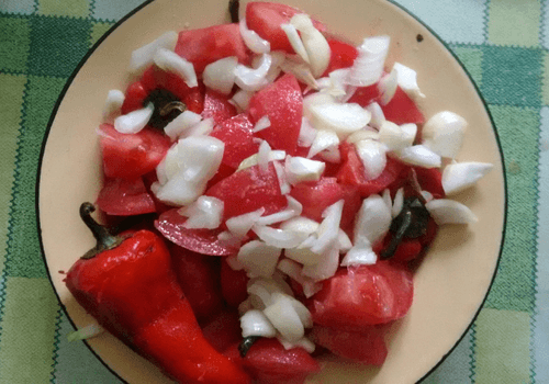 Печеный красный перец с розовыми помидорами и луком по-болгарски