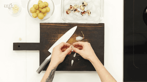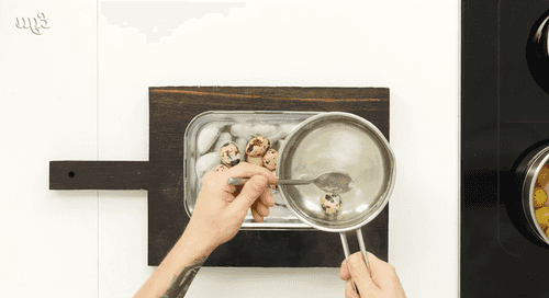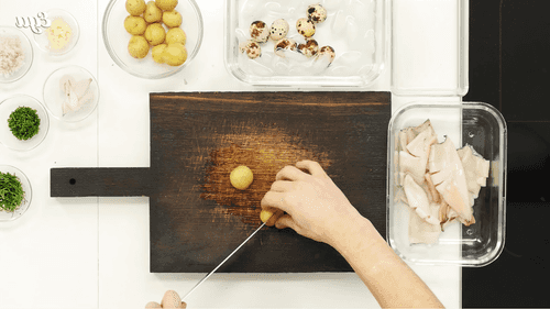 Картофель помыть и отварить. Перепелиные яйца сварить, затем остудить в миске со льдом.