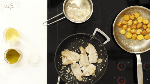 На сковороде обжарить мелко нарезанный шалот, добавить чеснок, а затем кальмары, влить вино и продолжать готовить 3-4 минуты. Добавить в смесь вино. Картофель также обжарить на сливочном масле до золотистой корочки.