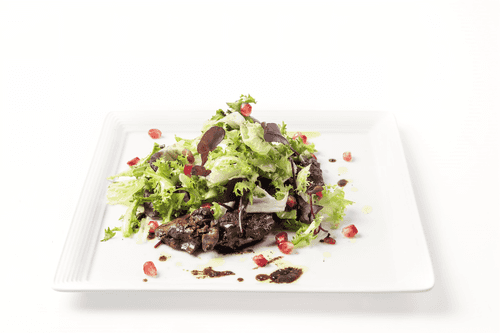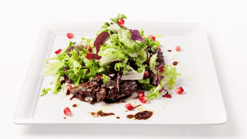 Выложить на тарелку печень, сверху салат, полить соусом и украсить зернами граната.