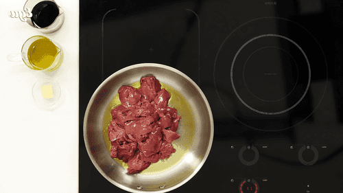 Печень быстро обжарить на смеси оливкового и сливочного масел, затем добавить бальзамический уксус и потушить на низком огне еще 3-4 минуты.