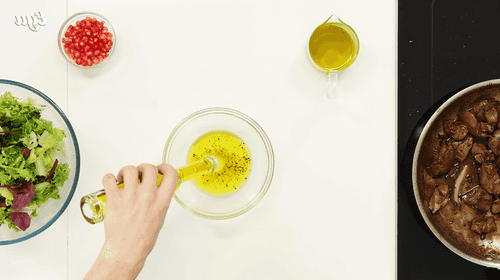 Выложить салатные листья. В отдельной миске оливковое масло смешать с соком лимона и каплей трюфельного масла при помощи венчика. Посолить и поперчить.