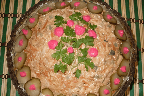 Салат заправить майонезом (по желанию можно добавить пару зубчиков чеснока) и хорошо вымешать. Выложить в салатник и украсить огурцами и петрушкой.