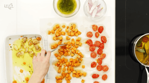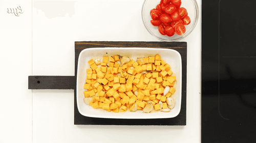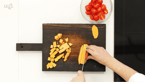 Помидоры разрезать на половинки, батат нарезать кубиком.