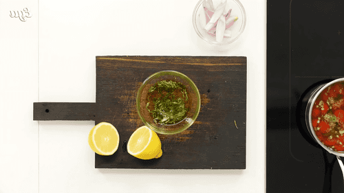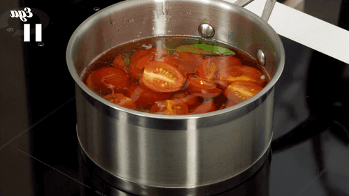 Помидоры сварить в смеси растительного и топленого масел на медленном огне, добавив веточку тимьяна и базилик. Это займет 15 минут.