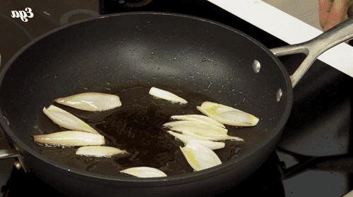 Шалот разрезать пополам и разобрать на «лепестки». Обжарить на оливковом масле до золотистого цвета.