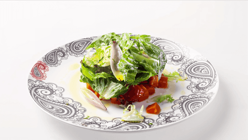 Через кулинарное кольцо выложить батат и помидоры, сверху выложить Микс Монпелье, полить соусом и украсить шалотом.