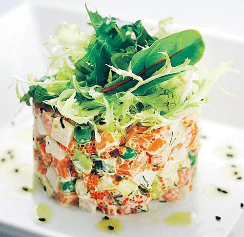 Рецепт оливье от Сергея Ерошенко, который можно попробовать в ресторане «Честная кухня», отличается от классического варианта. В этом салате вместо картофеля используется хурма, а традиционные ингредиенты, такие как говядина или язык, уступают место нежному мясу камчатского краба.