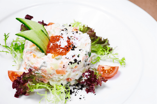 Салат оливье с лососем от ресторана — это утонченное переосмысление классического французского блюда. Он сочетает в себе нежность слабосоленого лосося и традиционные овощные компоненты, создавая богатый и сбалансированный вкус. Легкая пикантность хрена в заправке придает салату особую глубину, а украшение из икры и маслин добавляет нотку изысканности. Это блюдо идеально подойдет как для праздничного ужина, так и для легкого обеда, радуя гурманов своей гармонией и элегантностью. Каждый ингредиент дополняет друг друга, создавая композицию, где свежесть овощей сочетается с насыщенным вкусом лосося, а тонкие акценты земли из маслин и свежести зелени делают салат поистине незабываемым.