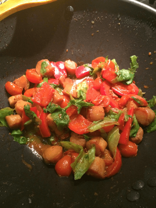 Если гребешок крупный, то нарезать пополам. Обжарить его до чуть золотистого цвета. Добавить перец, готовить минуту. Добавить черри, еще минуту готовить.