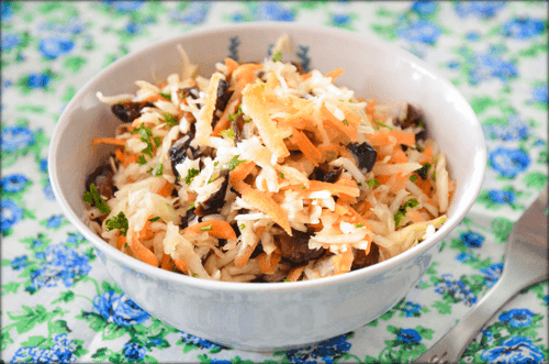 Салат из капусты с черносливом — это простое, но изысканное блюдо русской кухни, которое гармонично сочетает свежесть овощей и сладковатый вкус сушеных фруктов. Белокочанная капуста придаёт салату хрустящую текстуру, морковь добавляет сочность и лёгкую сладость, а чернослив — мягкость и богатый, насыщенный вкус с фруктовыми нотками. Петрушка освежает общую композицию, а соль подчёркивает баланс ингредиентов. Исторически сочетание капусты и чернослива было популярным в русской кулинарии благодаря доступности продуктов и их питательной ценности. Этот салат идеально подходит как самостоятельное блюдо или гарнир, особенно в зимние месяцы, когда он насыщает витаминами и заряжает энергией. Его лёгкость делает его отличным выбором для повседневного и праздничного стола.