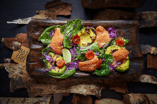 Салат с лососем и печеным авокадо