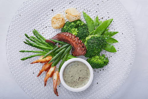 Подача: на тарелку выложить овощи, сверху в центр выложить морепродукты, полить трюфельным маслом. Трюфельный соус подать отдельно в соуснике.
