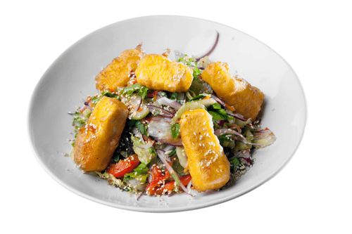 Салат с жареным тофу и кунжутом — это гармоничное сочетание свежих овощей, хрустящего тофу и ароматного кунжута. Его корни уходят в европейскую кухню, но он вдохновлен азиатскими традициями. Обжаренный сладкий перец, нежные огурцы и острый лук создают яркий вкус, который усиливается пикантной заправкой из соевого соуса, цитрусовых соков и специй. Темпура придает тофу аппетитную хрустящую корочку, а обжаренный кунжут добавляет ореховые нотки. Этот салат не только радует глаз, но и идеально подходит для легкого ужина или полезного перекуса. Благодаря балансу свежести, остроты и насыщенности, он оставляет приятное послевкусие и дарит гастрономическое удовольствие.