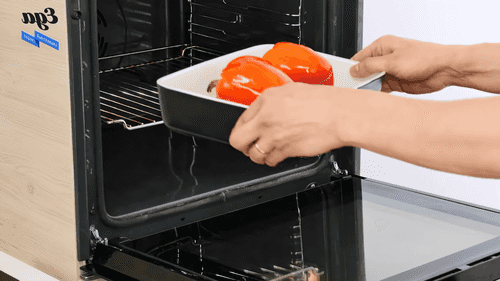 Сладкий перец отправить в разогретую до 180 градусов духовку, с функцией гриля, на 20 минут.