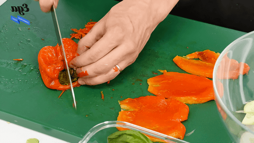 Лук нарезать соломкой, огурцы очистить и нарезать полукольцами. Базилик нарезать крупно. Перец достать из духовки, снять с него кожицу и нарезать соломкой.