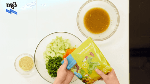 На сковороде немного обжарить кунжут. Смешать подготовленные овощи с заправкой.