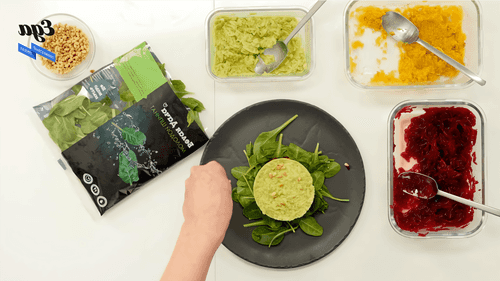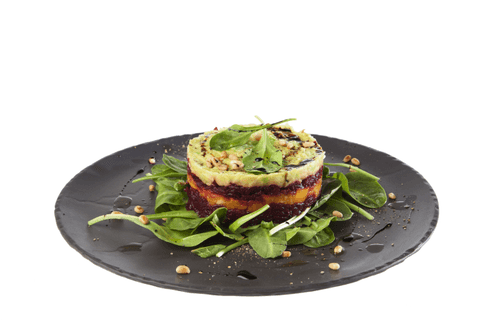 На тарелку выложить листья шпината, на них через кулинарное кольцо выложить слоями подготовленные овощи: cначала свекла, затем тыква, снова свекла и слой авокадо сверху. Посыпать салат кедровыми орехами и украсить бальзамическим кремом.