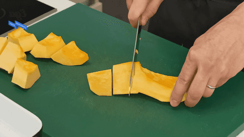 Тыкву крупно нарезать, сбрызнуть оливковым маслом и отправить в духовку, разогретую до 180 градусов, на сорок-пятьдесят минут.