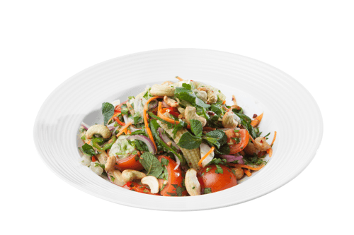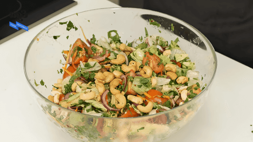 К нарезанным овощам добавить айсберг, кешью и заправку, перемешать руками и подавать.