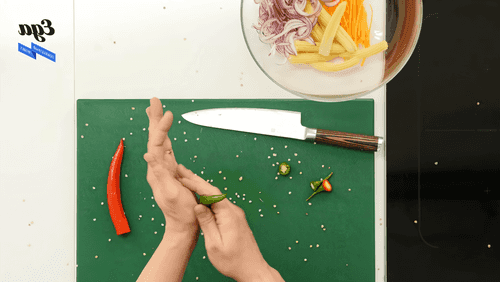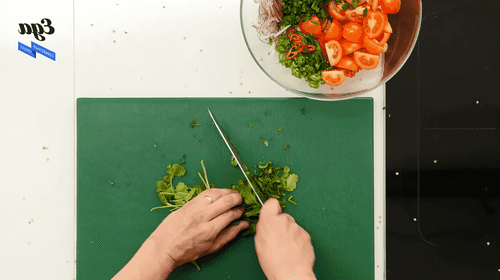 У чили удалить семена и нарезать их тонкими кольцами наискось. Помидоры разрезать на четвертинки.